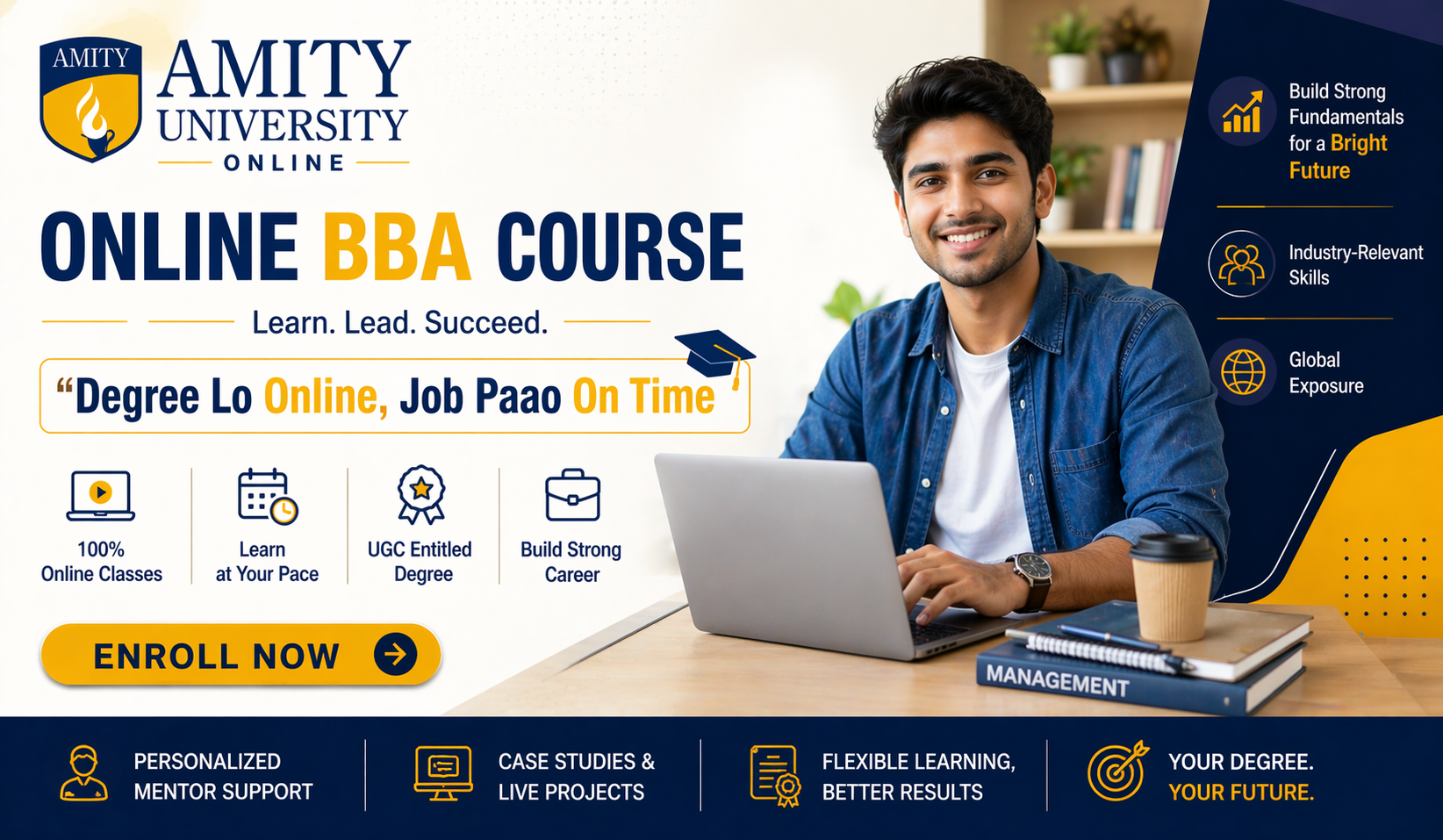 This also backs the New AI Learning Techniques, Specializations, and Enhanced Career Services, which add to the value of the degree. In 2026, Amity Online BBA will be your best choice for a business degree.